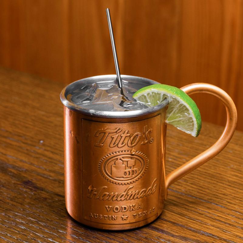 Ginger beer, pineapple juice, lime juice, fresh mint, and cinnamon simple syrup. Served in a copper mug