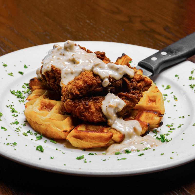 Fried chicken breast over house-made sweet potato waffle with honey-pecan butter. Smothered in creamy country sausage gravy