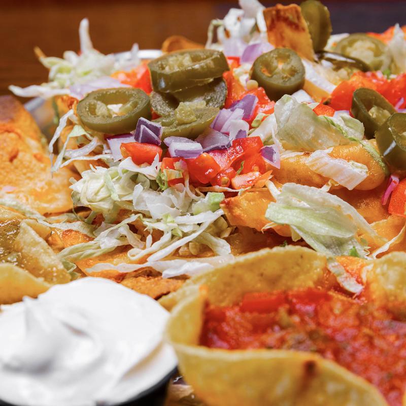 A plate full of fresh tortilla chips - topped with blended cheeses, shredded lettuce, tomatoes, red onion, and jalapeños. Served with two house-made salsas and sour cream | Add Chili +$3.50 | Roasted Chicken +$3.50