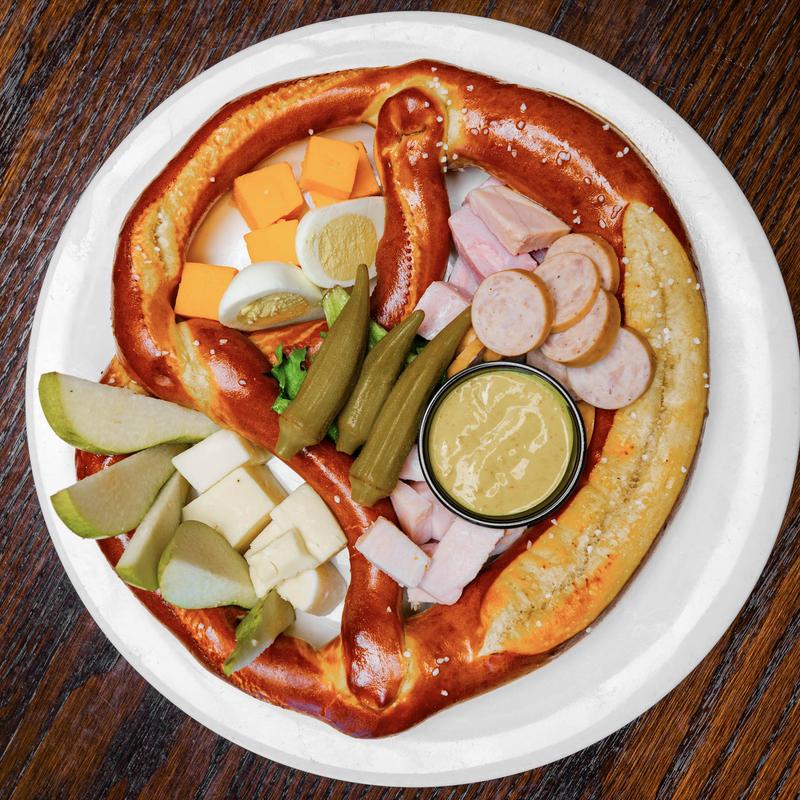 A generous selection of fresh cheeses, chunks of ham, turkey, and bratwurst. Served with a hard-boiled egg, pickled okra, apple wedges, a fresh pretzel, and ale mustard
