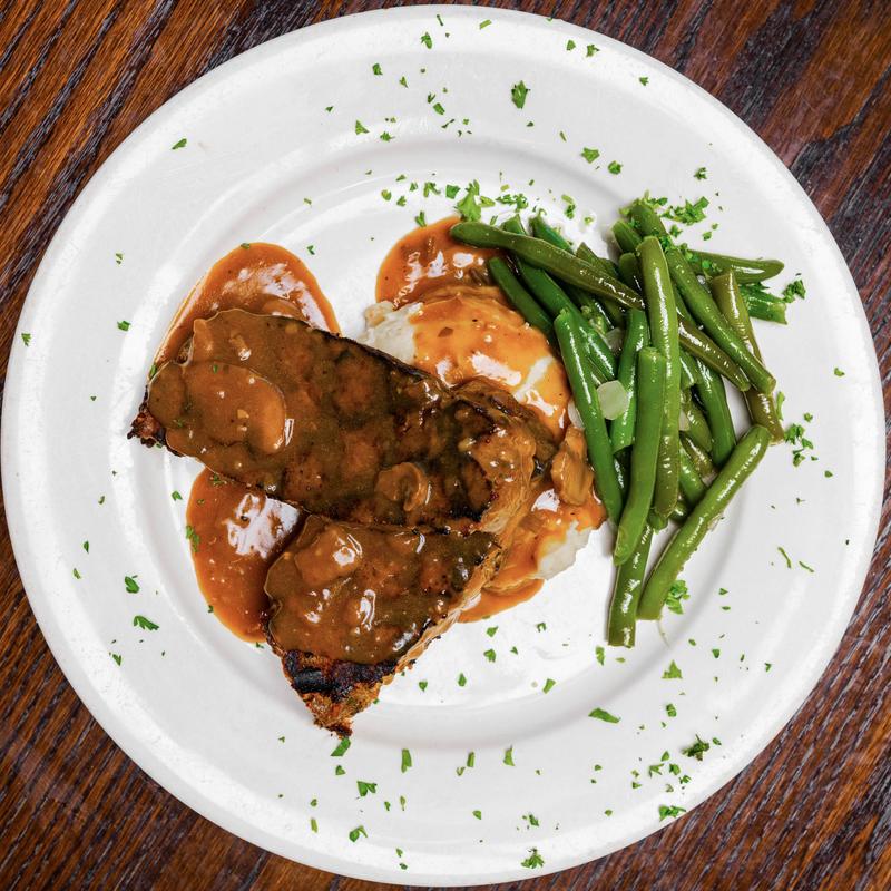 Served with mashed potatoes, red eye gravy, and succotash.