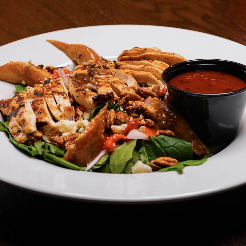 With grilled pear, crumbled gorgonzola, spicy pecans, red onion, and roasted red peppers over spinach