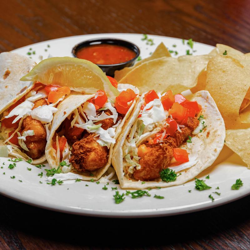 Flour tortillas stuffed with beer-battered cod, Monterey Jack cheese, marinated cabbage, and diced tomatoes. Served with two salsas