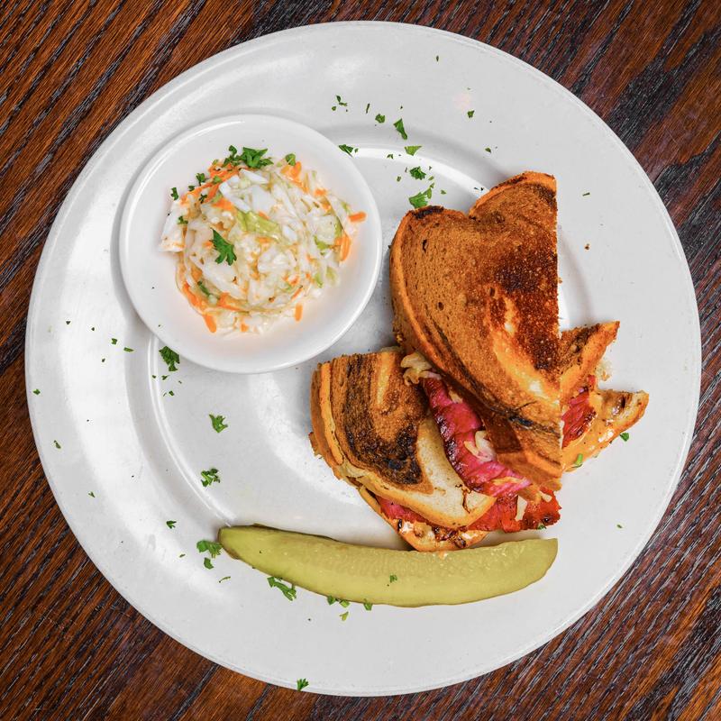 Corned beef with swiss cheese, kraut, and Russian dressing. Grilled on marble rye