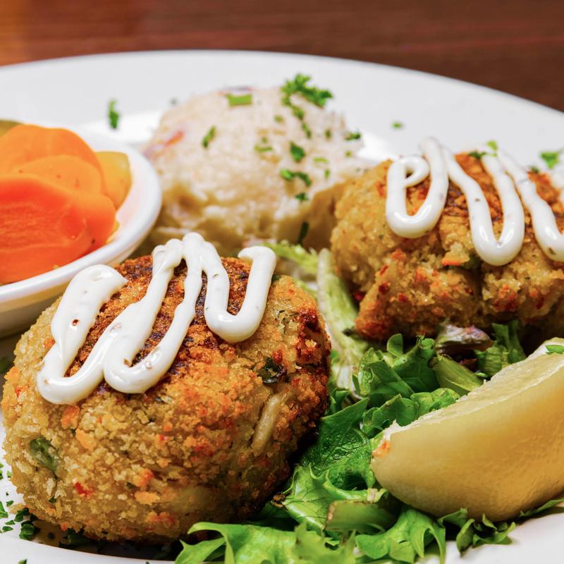 Griddled crab cakes with lemon-basil aioli, mashed potatoes, and sautéed mixed vegetables
