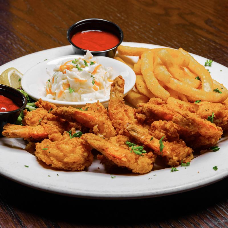 A dozen shrimp lightly breaded and fried. Served with French fries and cole slaw