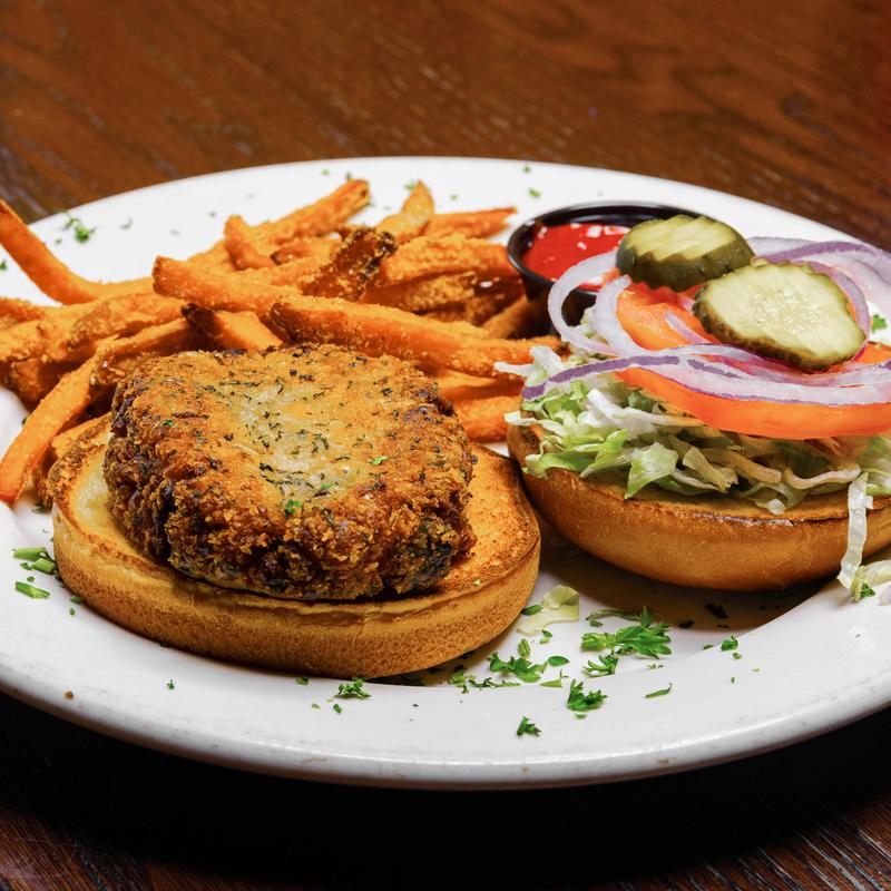 House-made vegan patty with wild rice, mushrooms, black-eyed peas, and a bunch of other stuff. Served with lettuce, tomato, red onion, and pickles on a non-vegan brioche roll