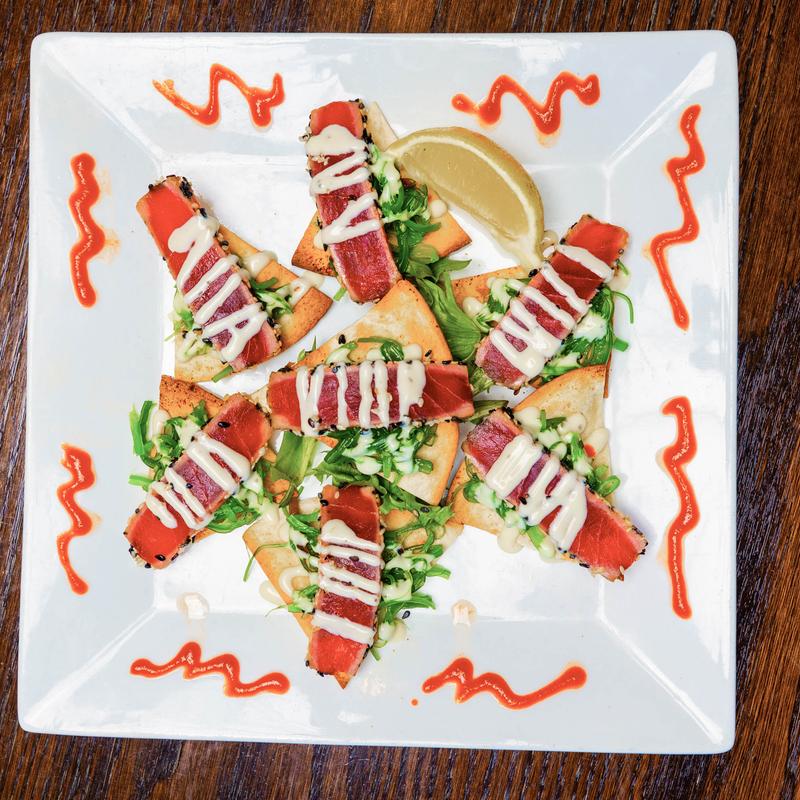 Sesame-seared rare tuna on flour tortilla crisps with seaweed salad, cucumber-wasabi cream, and sriracha sauce