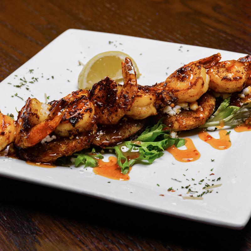 Topped with goat cheese, blackened shrimp, and Thai chili glaze